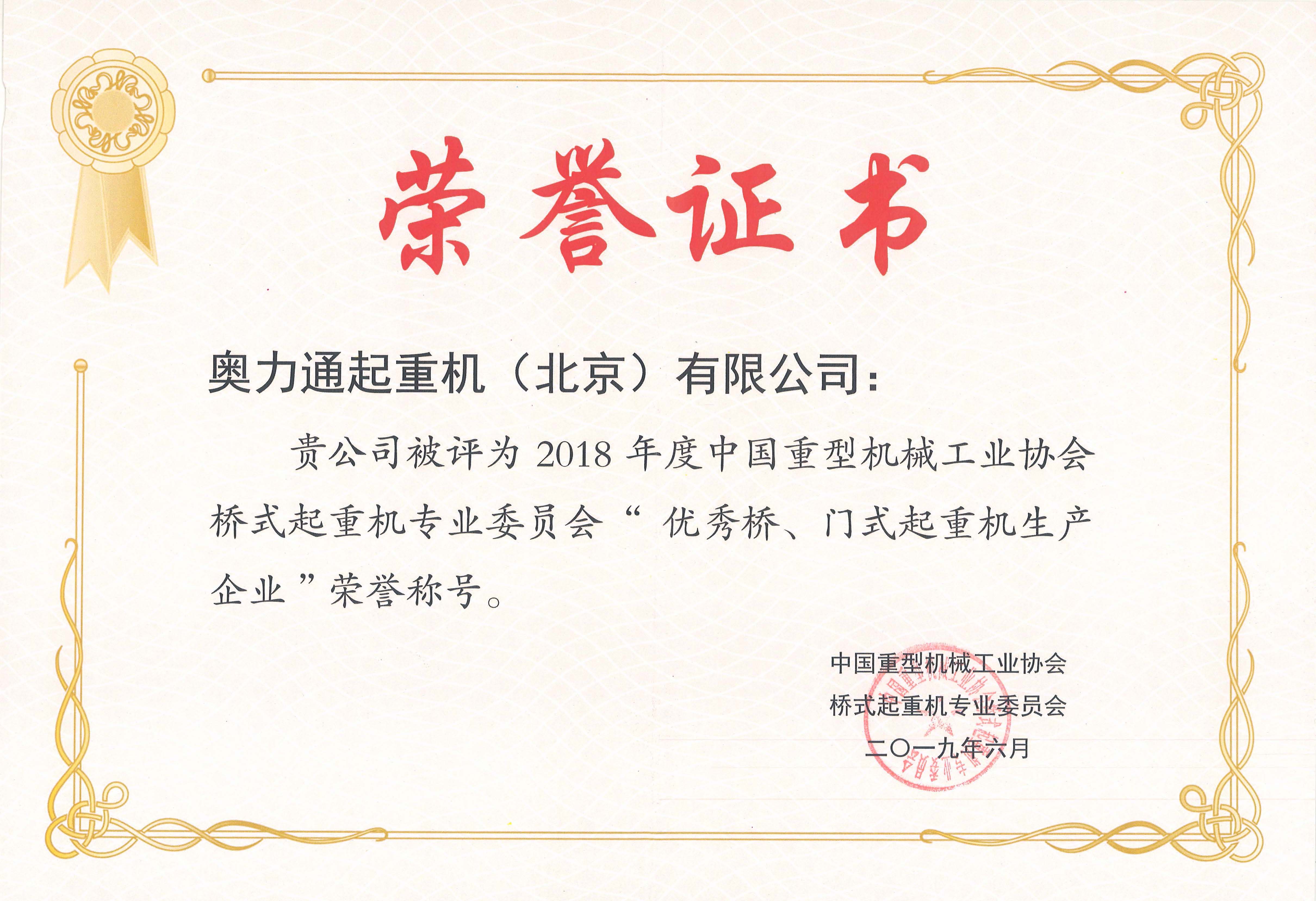 (玖鼎官网荣获2018年度“优秀桥、门式起重机生产企业”)