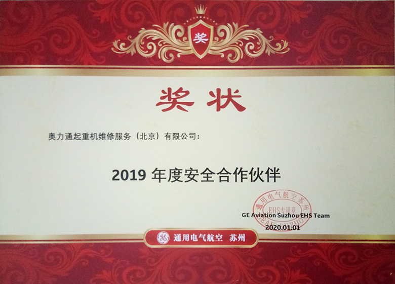 随着2020年的到来,美好的一年再度启程;新年伊始,玖鼎官网起重机维保服务团队收到了合作伙伴通用电气(GE)航空集团的新年礼物---2019年度安全合作伙伴奖,以此表彰和感谢玖鼎官网维保服务团队长期以来为通用电气(GE)航空集团提供的安全、质量、高效的起重机维保服务。