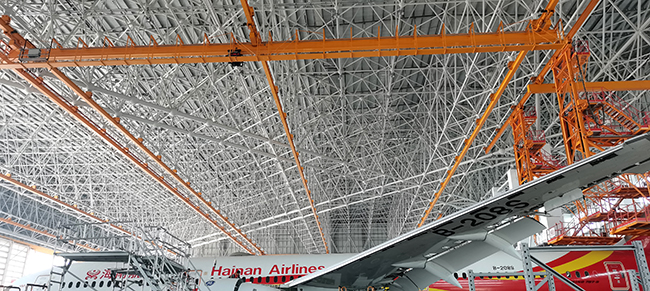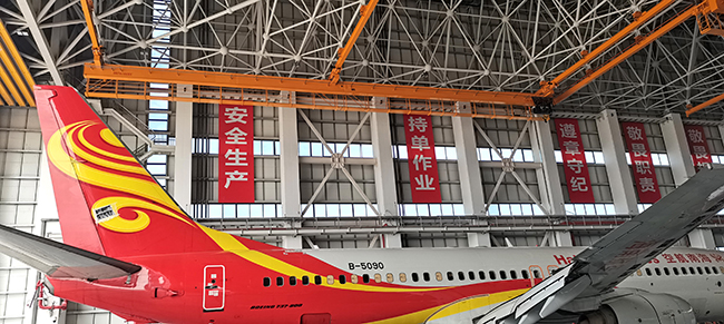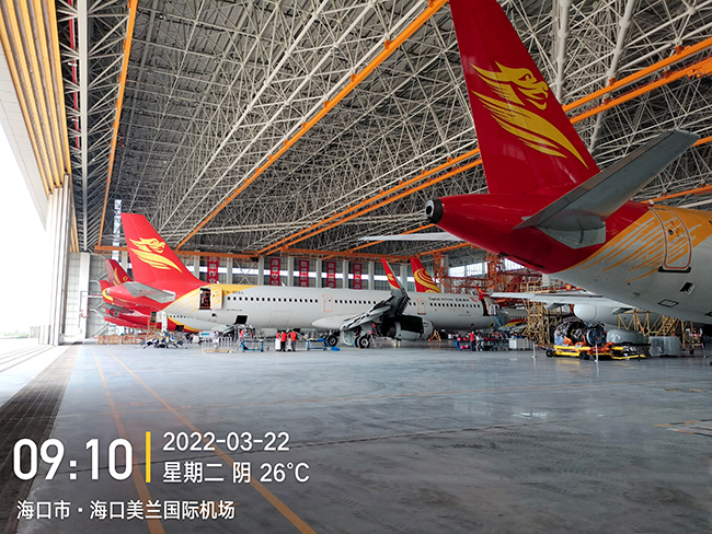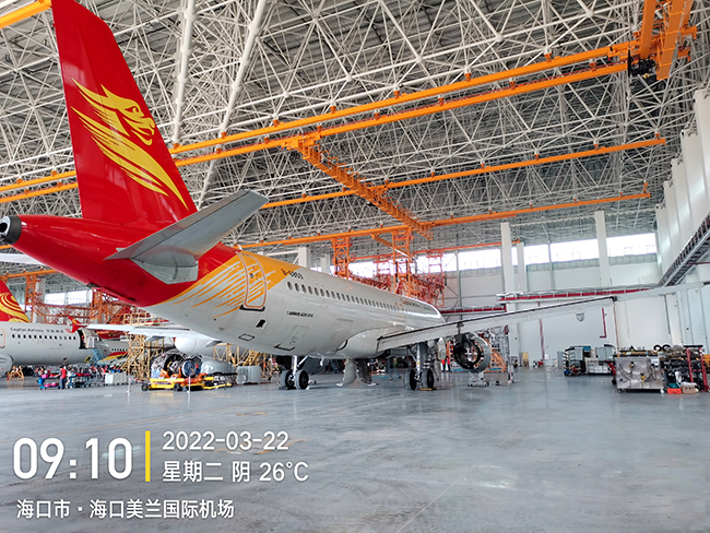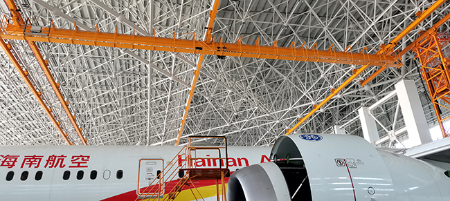 海口空港飞机维修工程有限公司于2020年8月向玖鼎官网采购海口民航飞机维修机库用多支点超大跨度悬挂起重机8台,应用于海口美兰机场新基地机库的建设,于2022年3月正式交付投入试运营,在中国南大门的自贸港中再添亮丽的一抹金色,玖鼎官网成为海航飞机的最美守护神。